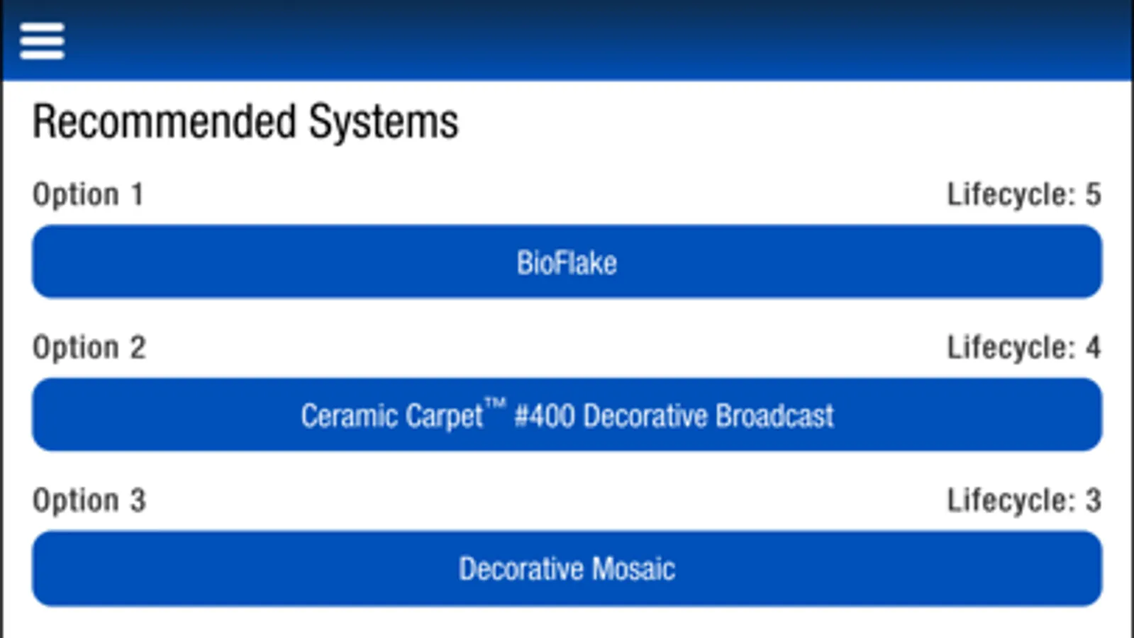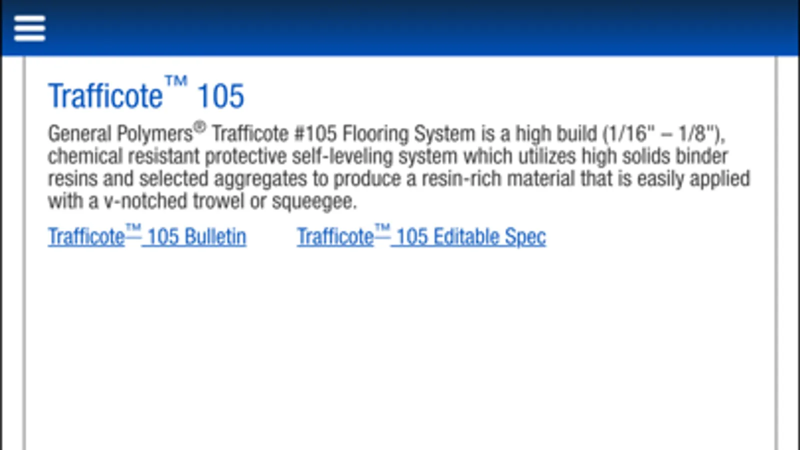 GP Flooring allows you to explore the best Sherwin-Williams General Polymers® system for each flooring area of your facility. Whether it is a decorative system for schools, a conductive coating for munitions storage, or an industrial system for commercial kitchens, Sherwin-Williams has your flooring needs covered. With comprehensive specifications for every floor requirement, GP Flooring is interactive, fast, and easy to use. Just choose the Flooring Type, Facility Type, and Area Description of your facility and the app returns system suggestions based on your specs, including: