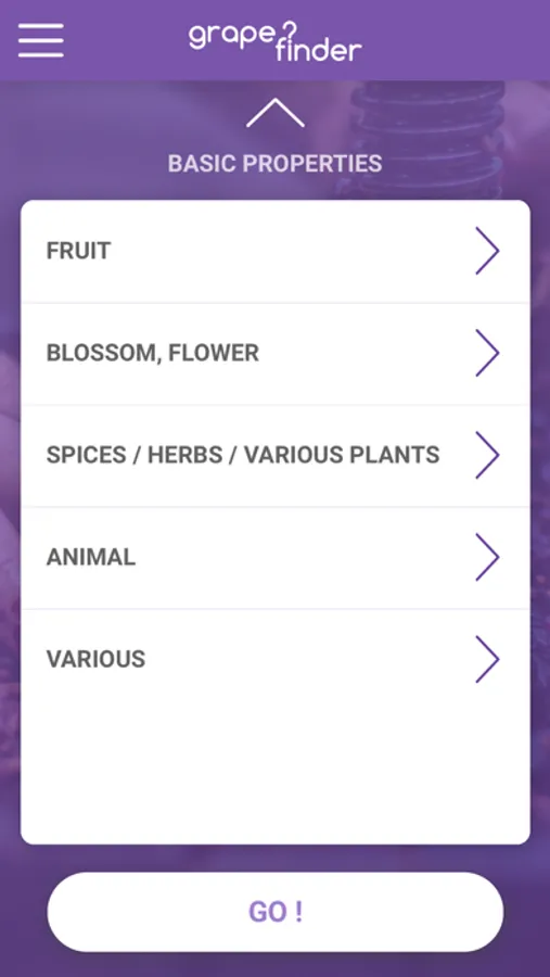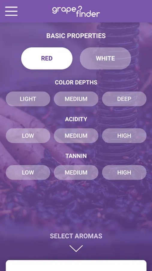 Grape varieties almost exclusively used in blends have not been considered. Instead, varieties from regions like Croatia, Bulgaria, Georgia, Cyprus and Greece were adopted. With sweet wines, some aroma will appear more concentrated and often reflect a complete different spectrum in respect to the dry wine made from the same grape. Therefore sweet wines are not (yet) included. Grape varieties for Sherry and Madeira have been assumed if the corresponding wines were made dry and fermented without flor yeast. Rosé, white wine made from red wine grapes as well as "orange wine" (white wine fermented like reds, i.e. with mash fermentation) are not (yet) included. With sparkling wines the aromatic picture alters, whereby the vinification method (tank or bottle fermentation, i.e. carbon dioxide and / or yeast) influences nose and taste. However, some basic character gleams, so that grape?finder may bring you to the right track.