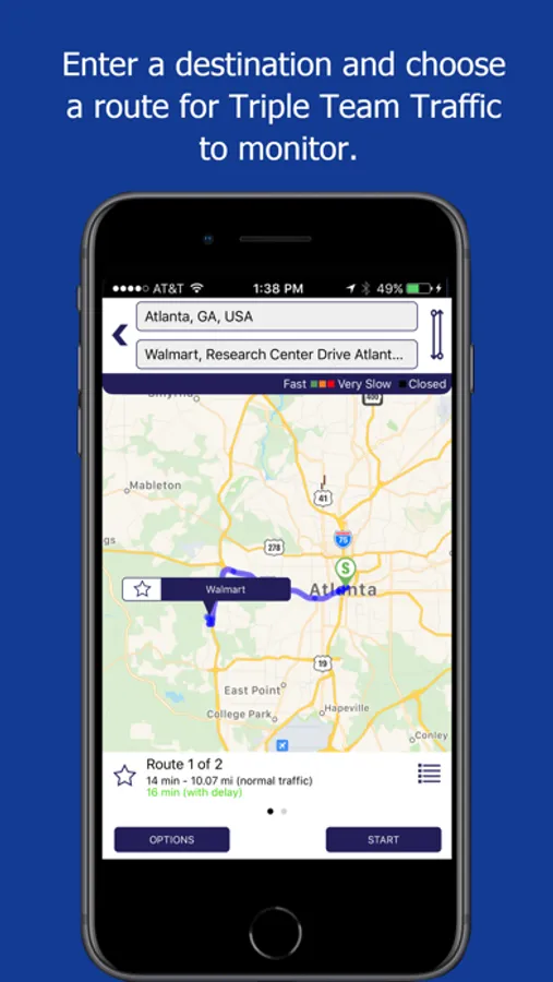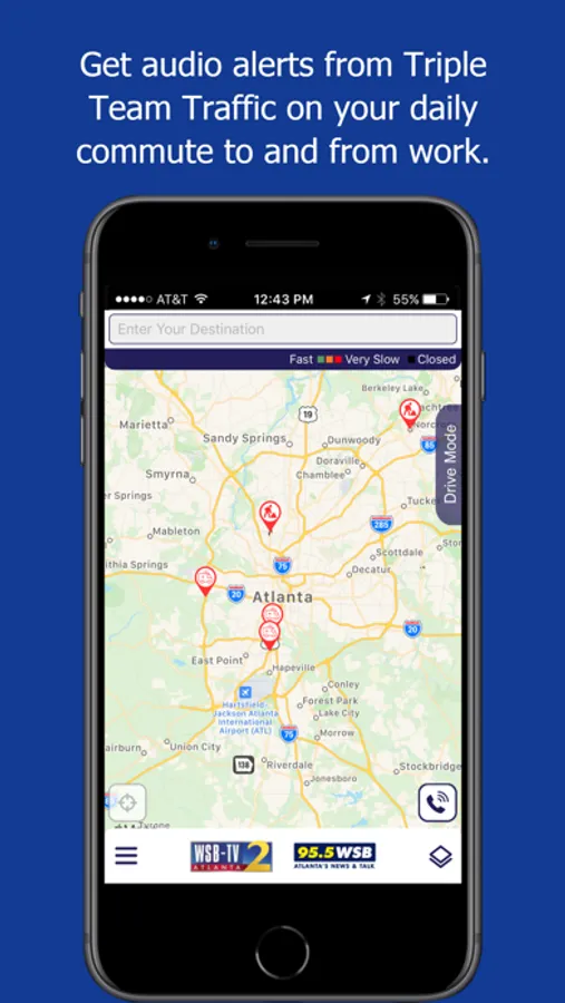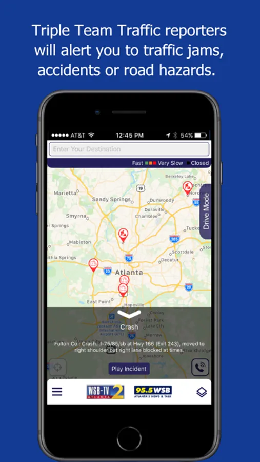 * Review the Map before you depart and easily see Incidents, Delays and Wrecks on your route, with text descriptions, and the WSB Traffic Reporters' audio reports. Or schedule notifications to alert you at your chosen time if there are any incidents on your route. Know Before You Go!