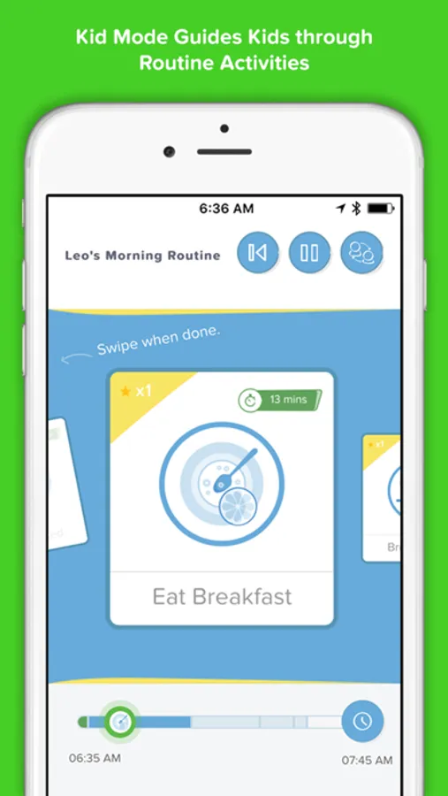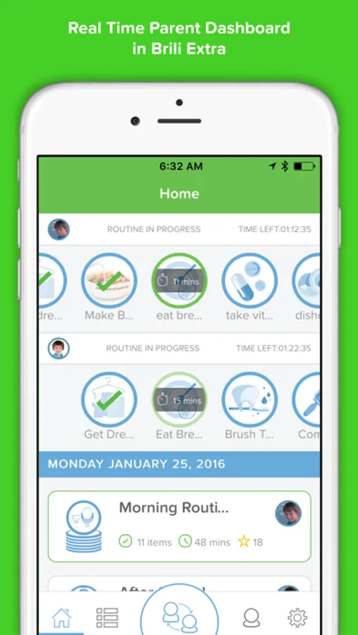 Brili displays kids' routines as a game in Kid Mode, showing them what's next, how much time they have left, and prompting them at the appropriate times to keep them on track. Parents can monitor in real time from a separate device, from anywhere.