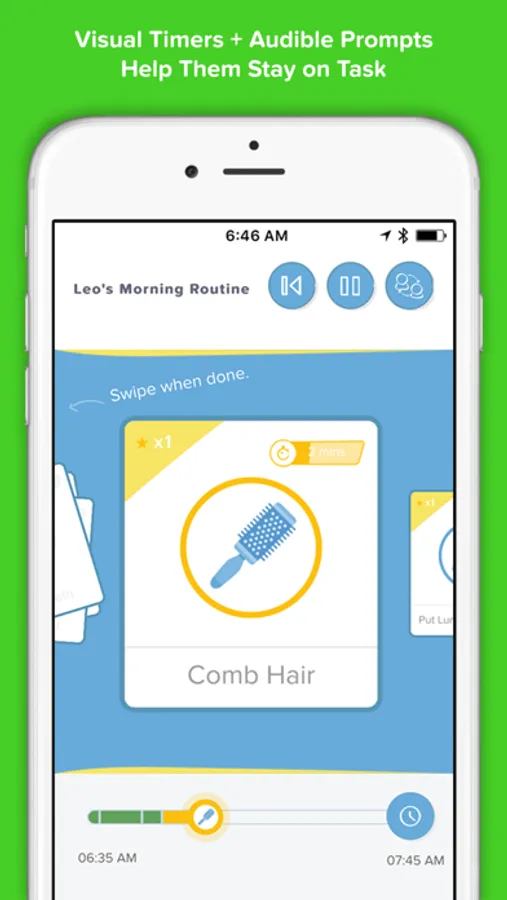 Brili includes visual timers with current activities shown in the context of the whole routine, helping children develop a good sense for timing. The app includes gentle audible prompts, notifications and alarms for scheduled routines.