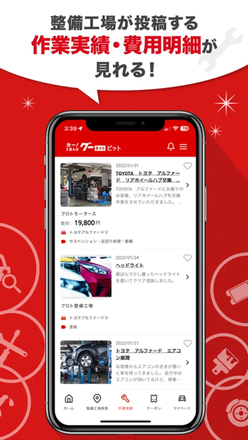 整備作業実績検索なら、整備工場が投稿した過去の整備作業実績を見ることができます。その時かかった工賃もわかるため、事前に費用の目安を知ることが出来ます。