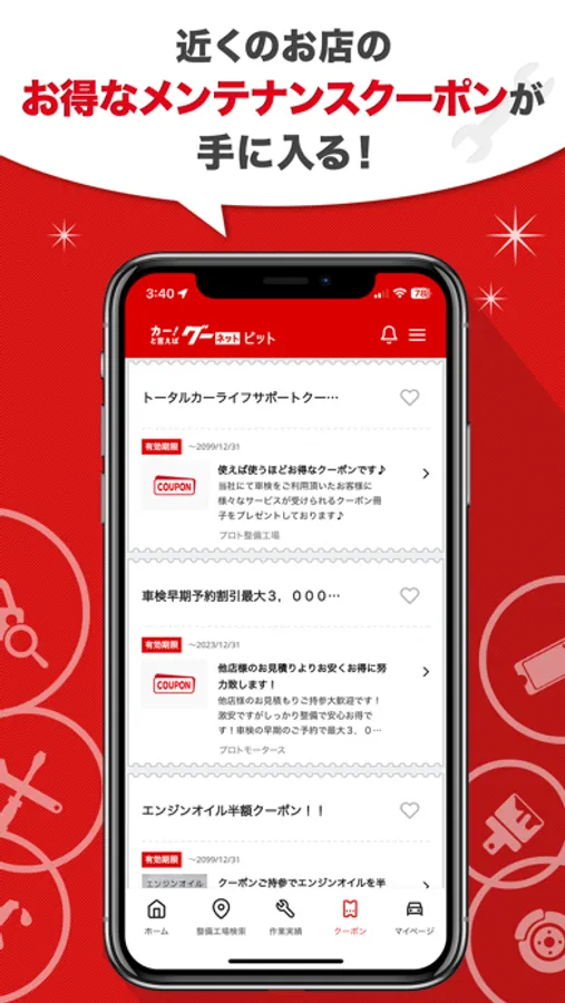 「車検割引」や「オイル交換無料」など、おトクなクーポンがいっぱい。