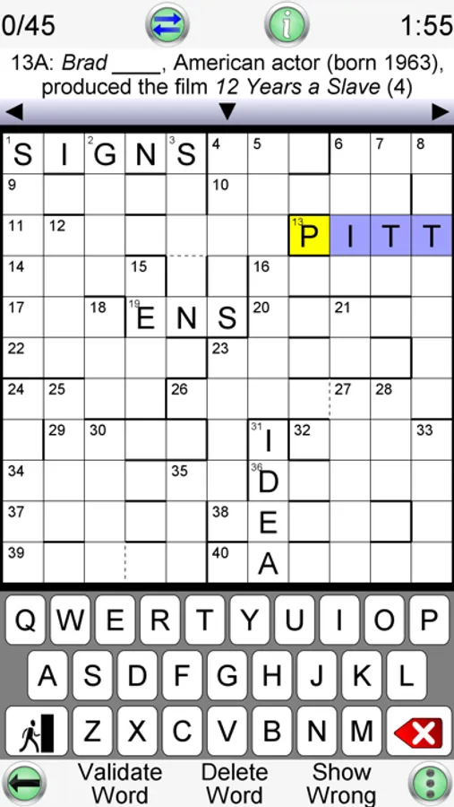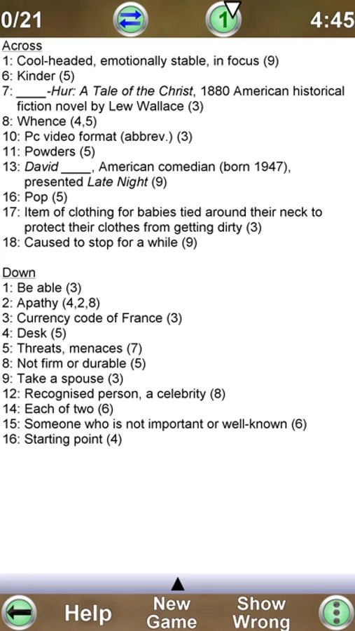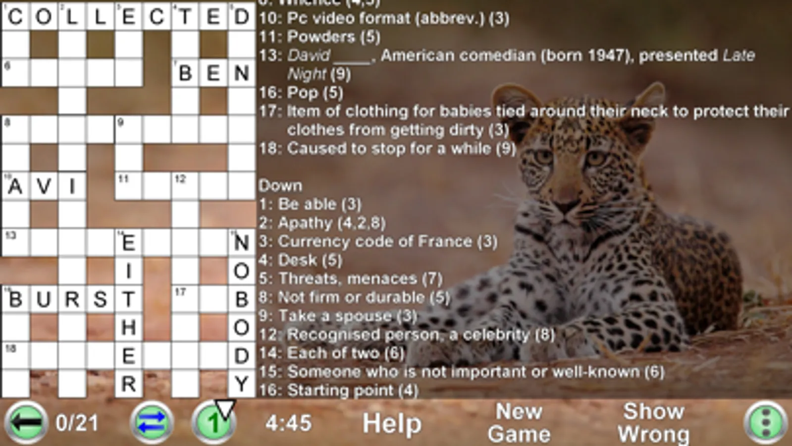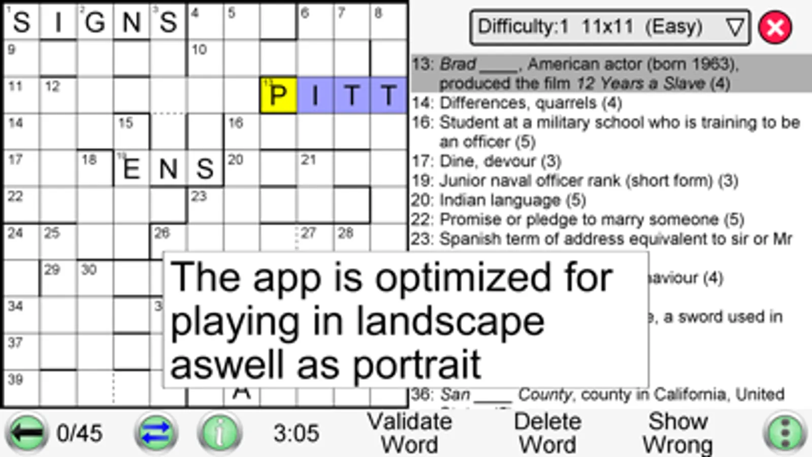 • Each new game is created by the app automatically. Therefore you can play an unlimited number of crosswords!!