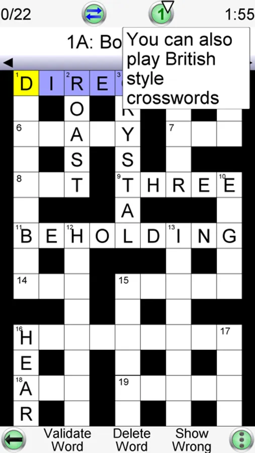 • Ability to save games and reload games. Play many games at once, just like a crossword book!