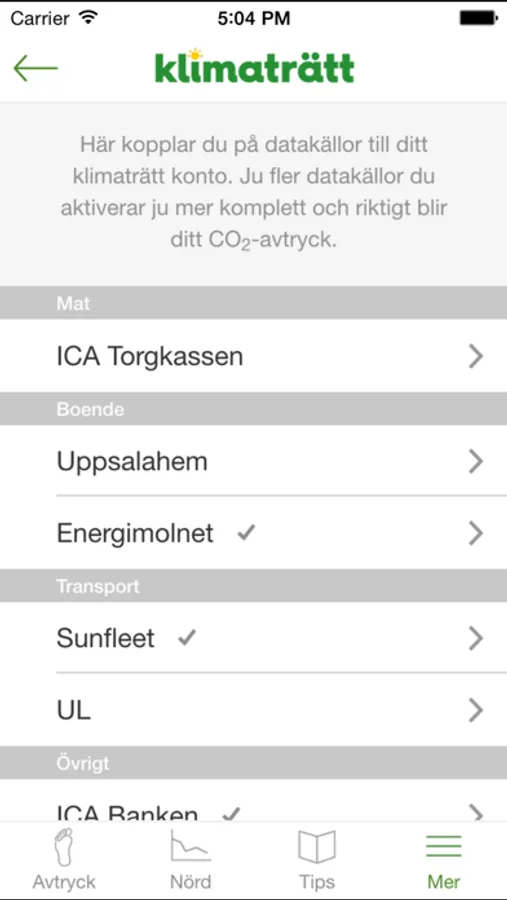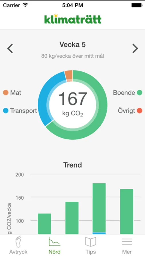 The Klimaträtt-app is developed within the frame of a bigger project with the same name. This project's purpose is to create an opportunity for people to re-adjust to a more climate-smart lifestyle without having to make big sacrifices and without great costs. Much of the power lies in us all when we make our choices as consumers. The project combines the opportunity to give continuous feedback on your personal carbon footprint through this mobile-app, with information and offers about climate-smart choices, products and services from the different participating partners.
