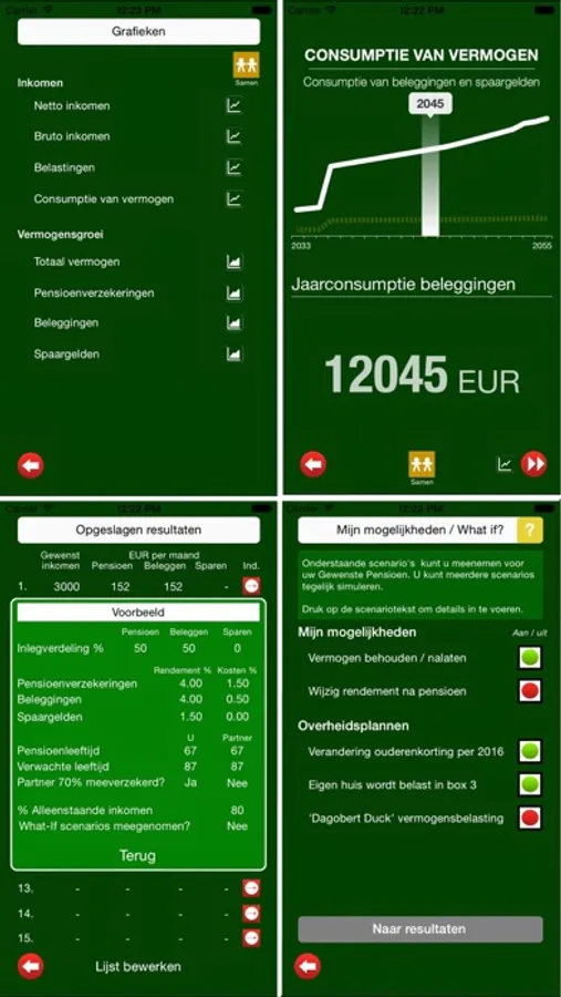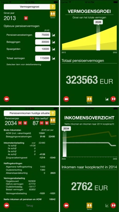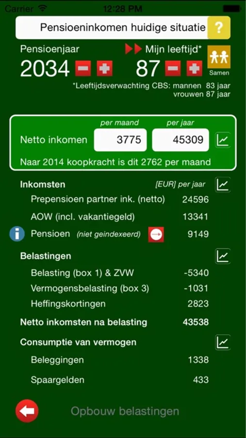 ▸ Uw pensioeninkomsten, vermogensopbouw en -consumptie, en belastingen zijn transparant gemaakt, tevens grafisch te volgen over alle jaren heen. Uw pensioen is zowel gezamenlijk als individueel inzichtelijk gemaakt indien u samen één fiscaal huishouden heeft.