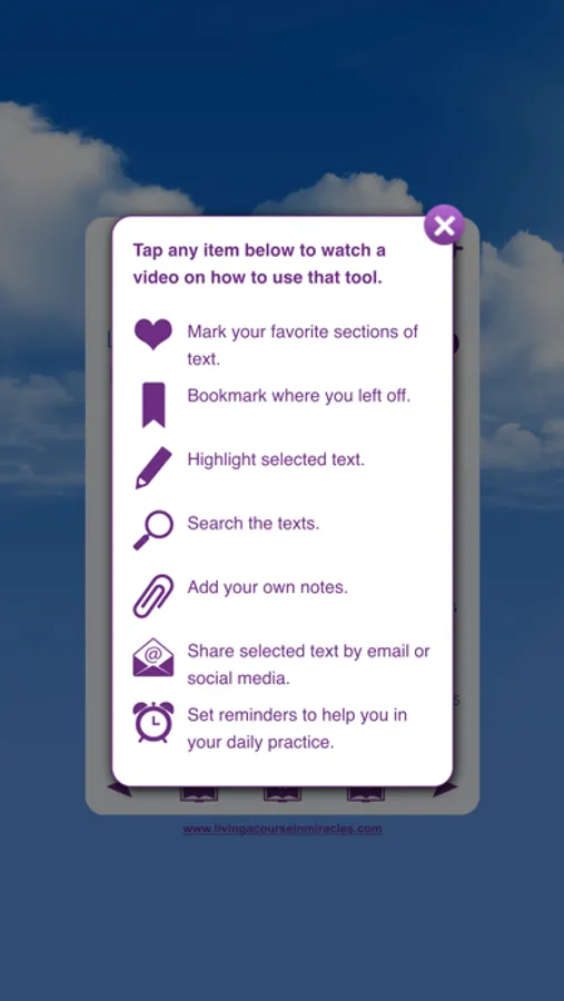 • Reminder Alarms - set your own alarm reminders with pop up text and optional sound to aid your daily practice - includes the ability to pick whatever text you like as your reminder - set the reminder times at increments that work for you. Easily change it every day to support your study of the Workbook Lessons.