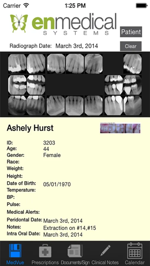 IPad and iPhone application to connect to Dentistry databases allowing the presentation of patient radiographs, prescriptions, documents and patient information. Allows for detailed preview of high resolution radiographs and oral imaging. Patient documents can be signed and approved online. A patient scheduling calendar is viewable to navigate to detailed patient information.