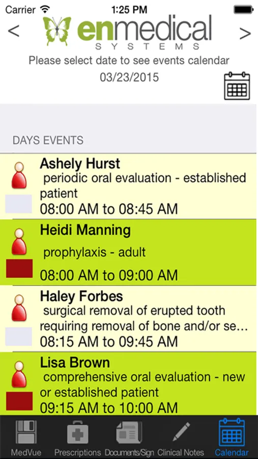 The application allow for selection of patients by name or partial name, phone number or medicaid number. The patients complete hi-resolutiion radiographs and orals may be viewed. All documents and images may and clinical notes can be displayed, edited and interactively signed and approved. The calendar of client events and appointments can be viewed by calendar date and selected to see further patient information.