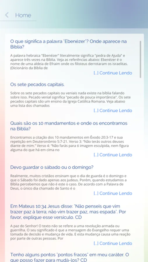 Durante muitos anos a Escola Bíblica da Novo Tempo tem recebido perguntas de pessoas interessadas em conhecer mais sobre a Bíblia e o que esse livro diz sobre vários aspectos da vida diária. Esse aplicativo reúne um acervo de mais de 2000 respostas e você poderá acessar facilmente digitando o tema ou palavra-chave.