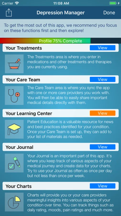 When you are living with Major Depression, the Depression Manager can help you manage the symptoms that affect you every day. Studies show that people with chronic diseases can positively affect their lives by using @Point of Care apps to track pain, medications, and more—giving a sense of control over their conditions.