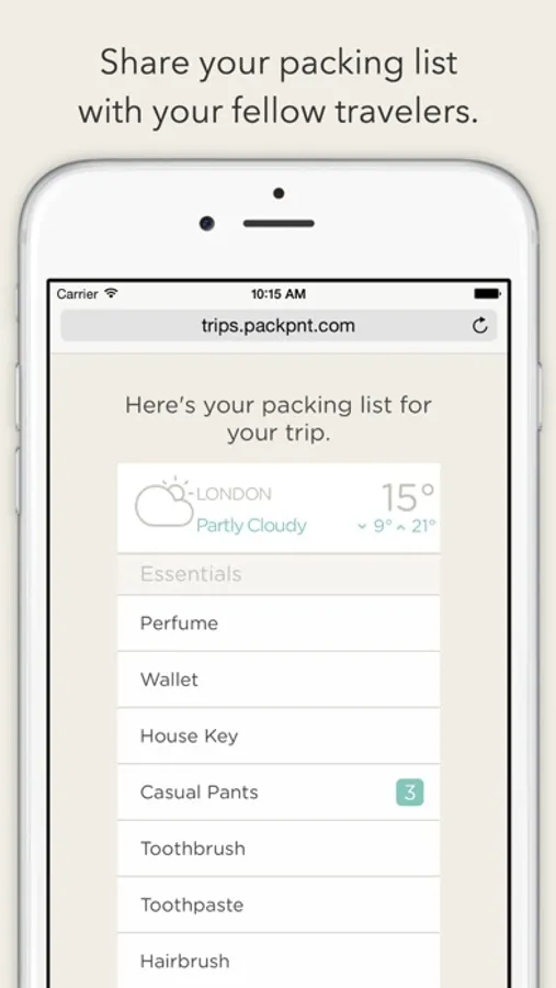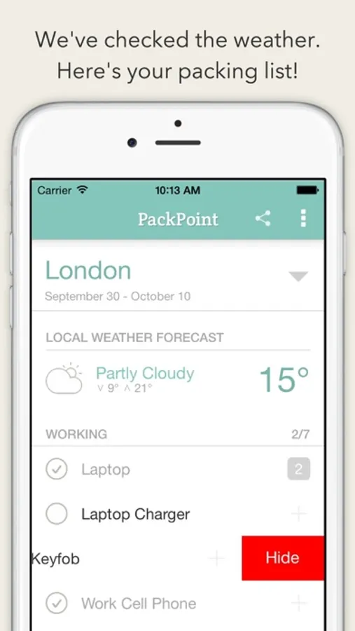PackPoint is an intelligent packing app and packing list builder for serious travelers. PackPoint will tell you what you need to pack based on length of travel, weather at your destination, and any activities planned during your trip.