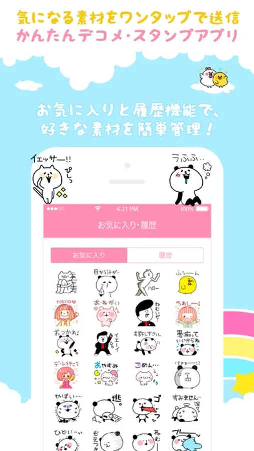 ココロスタンプなら、お気に入り機能や履歴機能で、好きなスタンプ・デコメを簡単に管理する事ができます。