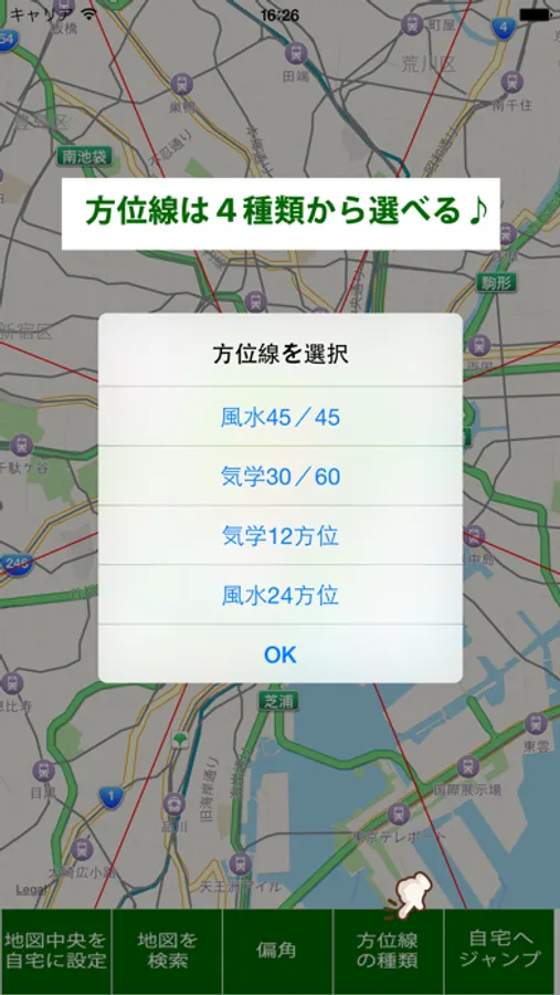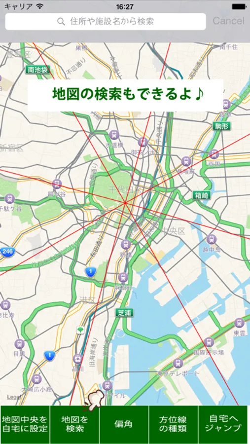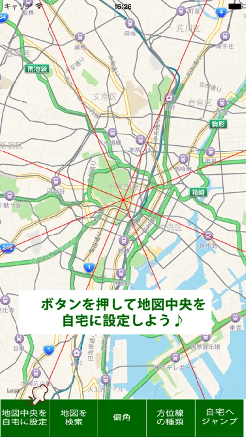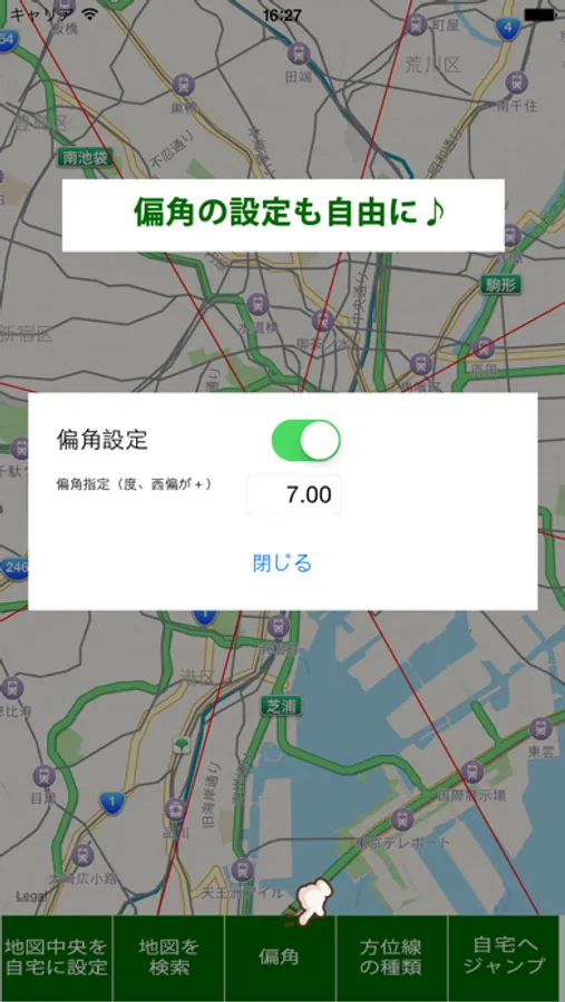 ・球面三角法を用いた方位線により、正しい方位が一目でわかります。