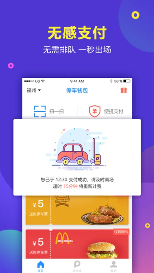 【智能支付】通过提前扫码支付或授信支付无感出场,不停车,免排队;