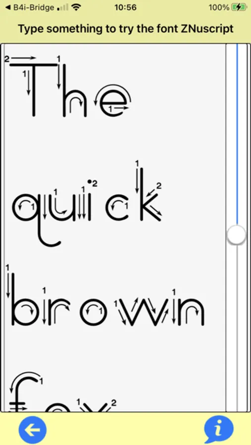 It uses the familiar stick and circle method, conform to Zaner-Bloser methods. Swipe left or right goes up and down the familiar “adcdefg…”, swipe up or down, and you get another of the 16 fonts in the pack.