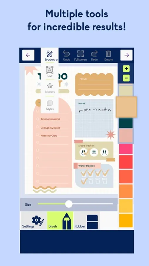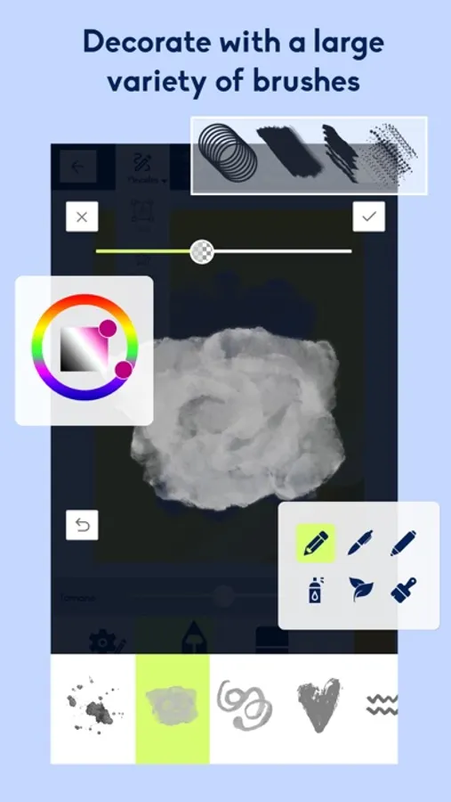 • Multiple brushes to scribble with your finger: charcoal, spray, decorative...