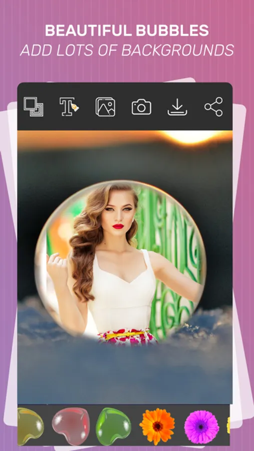 Do you want to create bubble overlays of your photos, then you can make your images stunning by applying cool bubble mask. This will also create bubbles photos with awesome wallpapers and stickers. Send lovely and beautiful pictures to your girlfriend, family, lover, friends with sweet bubbles and much more.