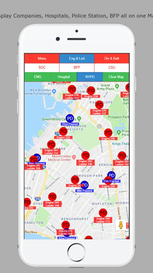 One button phone call and one button navigation to FDNY EMS stations, Fire houses, Police Stations and Hospitals