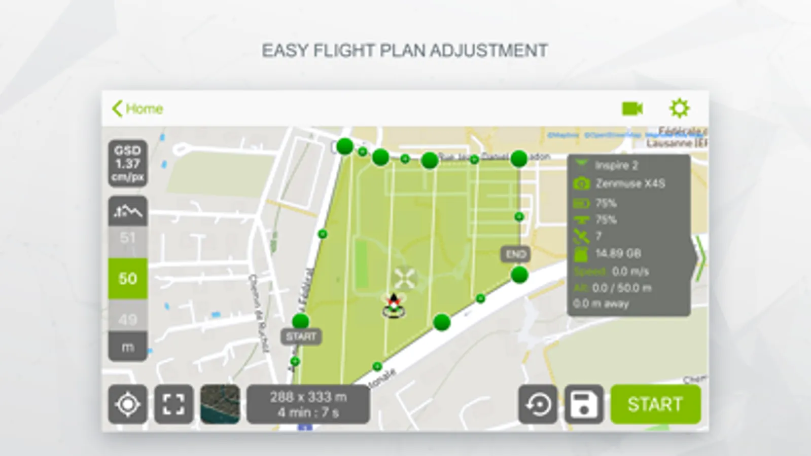 • Flight parameters for each mission - front & side image overlap, camera angle, altitude, GSD, flight speed - can be adjusted based on the requirements of the area.