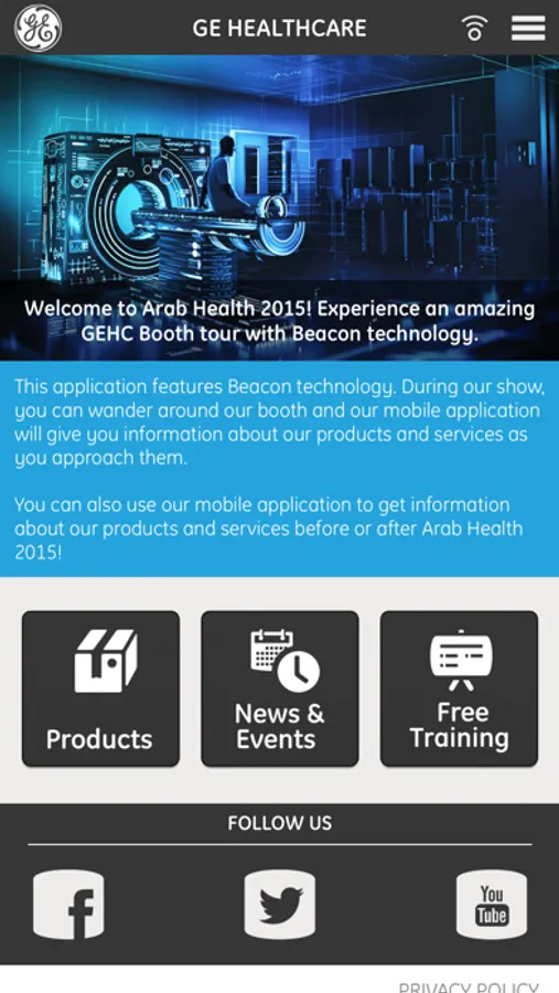 GE Healthcare provides transformational medical technologies and services that are shaping a new age of patient care. Our broad expertise in medical imaging and information technologies, medical diagnostics, patient monitoring systems, drug discovery, biopharmaceutical manufacturing technologies and performance solutions services help our customers to deliver better care to more people around the world at a lower cost. This application has the unique Beacon Technology that gives the chance indoor location based information services for our exhibition booths in Middle East and Africa.