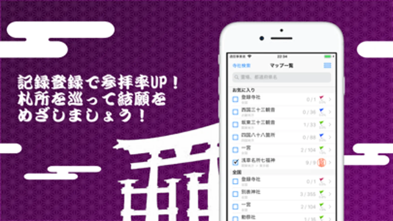 参拝記録を登録すると、マップ上の旗色や一覧の参拝率が自動で変化。