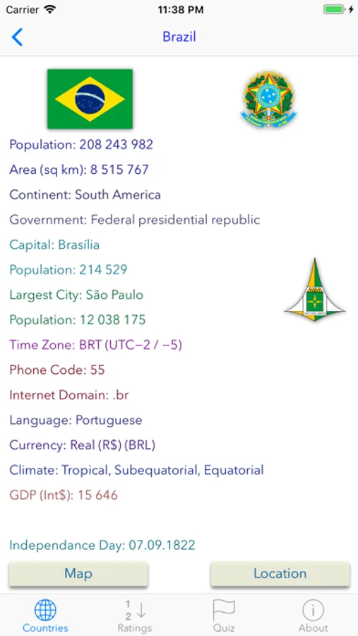 Countries data, national flag, coat of arms, capital, largest city, time zone, currency, government, climate zone, internet domain, phone code and maps are up to date in 2020.