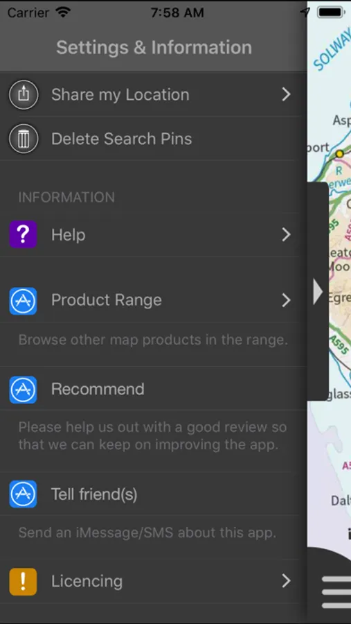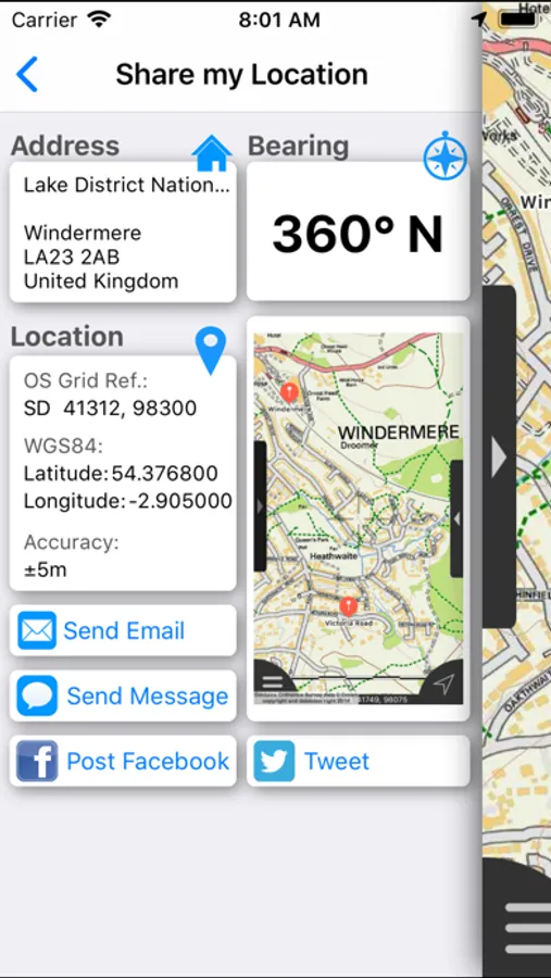 - "Share My Location" allowing users to share an image of their current location and location references. Buttons are provided to share location information by Facebook, Twitter, iMessage/SMS and e-mail