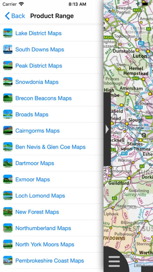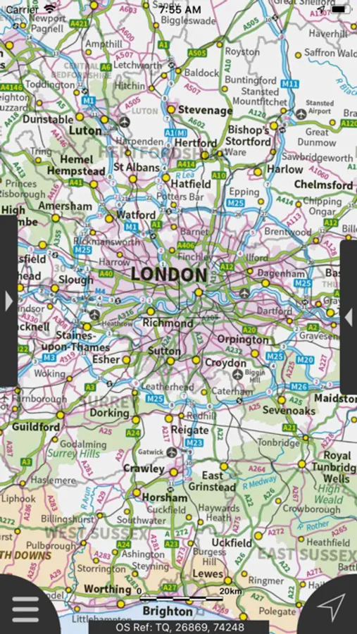 The map region of the more detailed maps covers a rectangular region around the M25 orbital motorway (ref. http://jomosolutions.com/Maps)