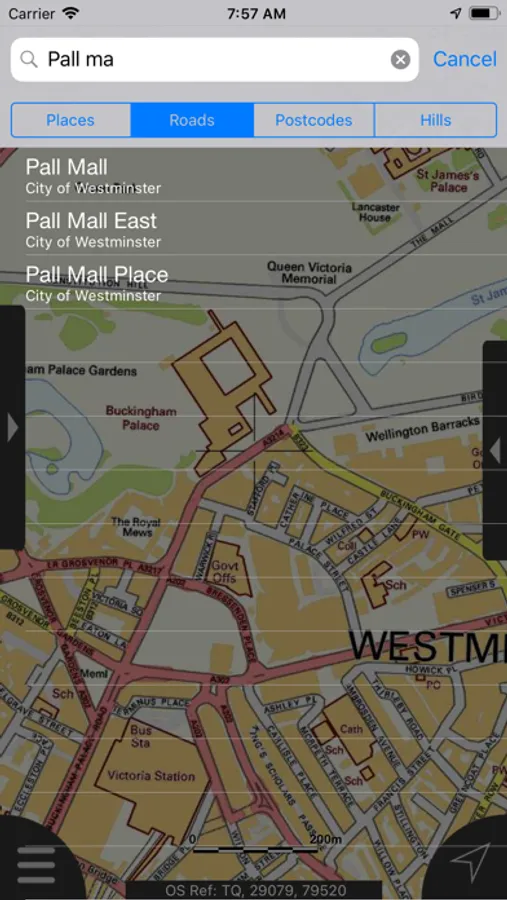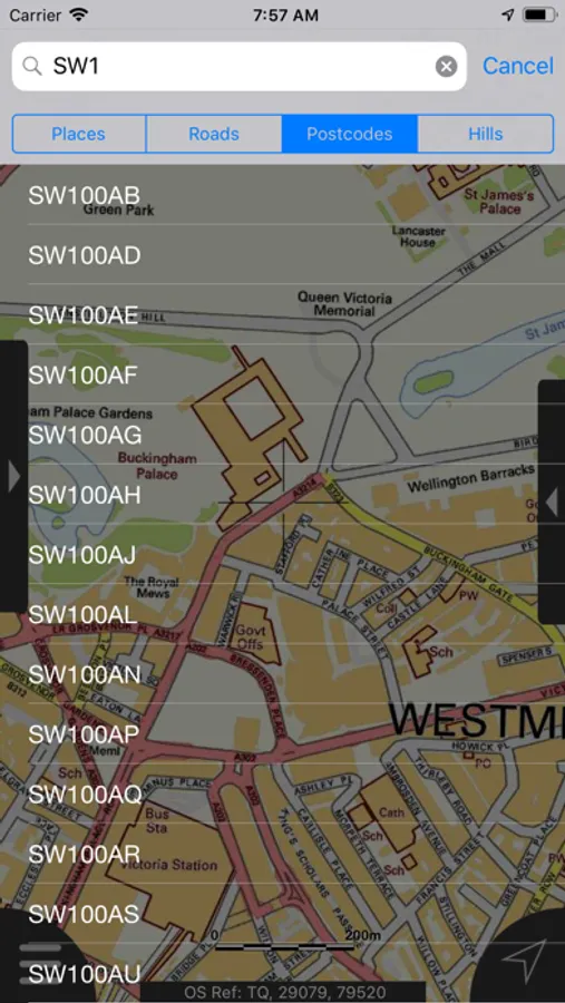 - Offline search functionality with searchable locations (places, roads, post codes and hills). (For the place search a location's latitude and longitude is accurate to 0.1 of a minute of the centre point of the 1x1 km National Grid square in which the name falls)