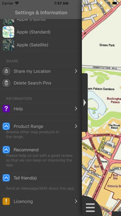 - "Share My Location" allowing users to share an image of their current location and location references. Buttons are provided to share location information by Facebook, Twitter, iMessage/SMS and e-mail