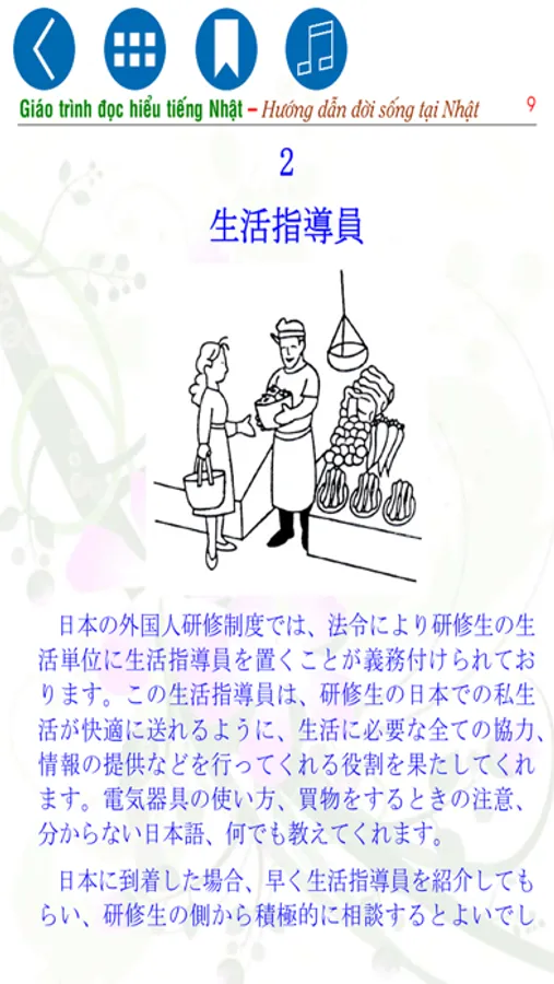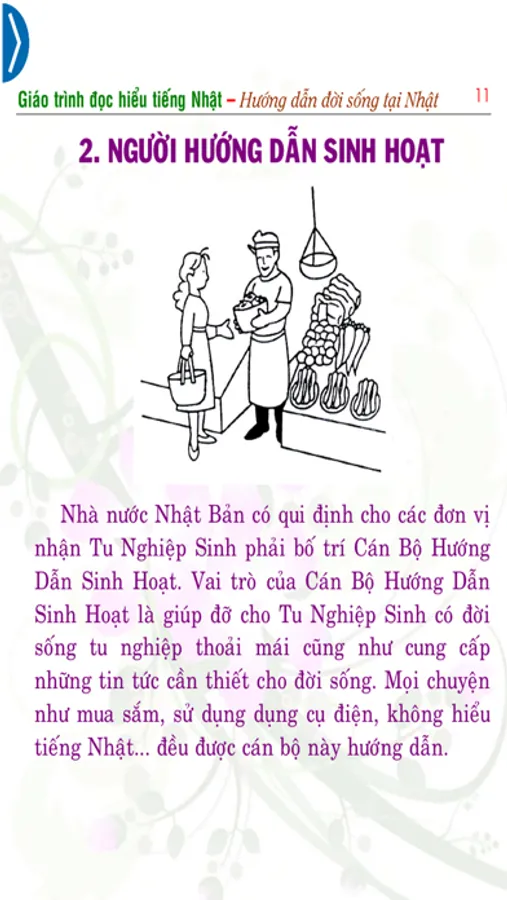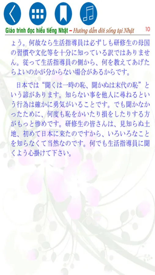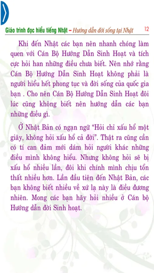 Giáo trình này được thể hiện dưới dạng song ngữ giữa tiếng Nhật và tiếng Việt giúp cho các bạn hiểu thêm về cuộc sống hàng ngày của những Tu Nghiệp Sinh, những điều cần tránh khi sang nước bạn để cư trú và là tài liệu không thể thiếu đối với các bạn học tiếng Nhật dùng để luyện đọc năng cao khả năng đọc hiểu tiếng Nhật mà trên thị trường hầu như chưa có giáo trình luyện đọc tiếng Nhật như thế này.