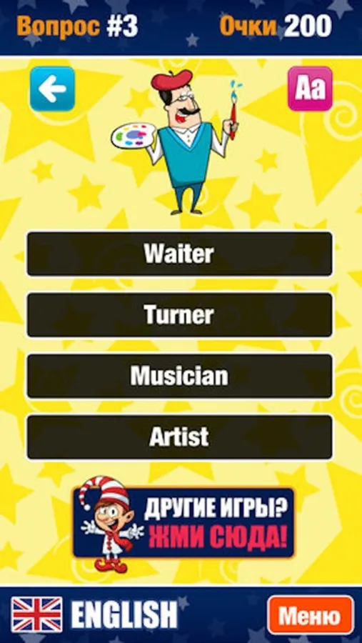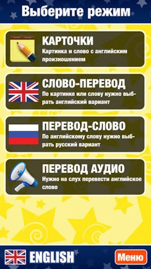 Второй и третий режимы представляют собой викторину и служат для проверки усвоенного материала. Включают в себя перевод с английского на русский и наоборот.