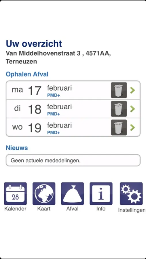Met deze app van de gemeente Terneuzen vergeet u nooit meer uw container op tijd buiten te zetten! U krijgt namelijk een melding als wij uw container komen legen. Als er een wijziging is in de inzameldag, dan ontvangt u hierover ook bericht. De app is bedoeld voor iedereen die in de gemeente Terneuzen woont en beschikt over een smartphone of tablet. De gemeente Terneuzen stelt de app ‘Afval Terneuzen’ gratis beschikbaar in de Play Store en de App Store.