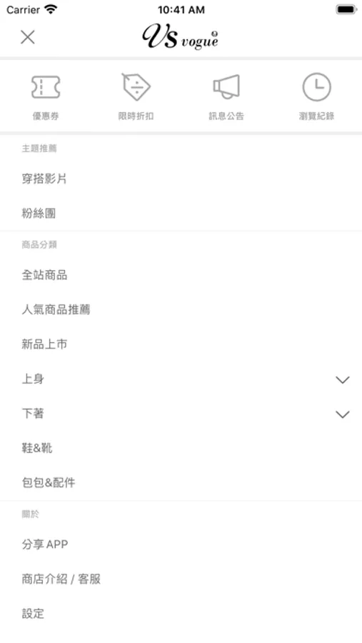 VS.vogue給予女孩們全新的視覺饗宴,以輕鬆氛圍打造賣場風格,精選的單品讓你輕鬆展現流行時尚。我們擁有熱情.穩定.負責的服務態度.用心為你挑選最優質的單品,希望每個女孩都能以愉快的心情享受愛美的樂趣。