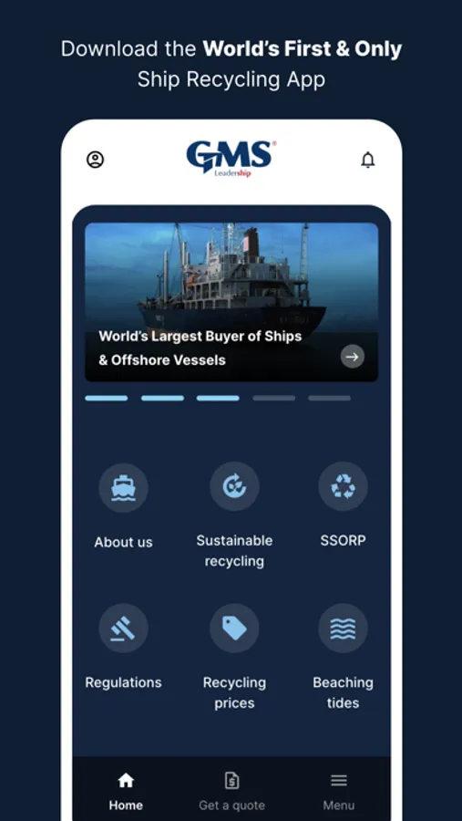 Download the GMS Leadership app to get the best vessel quotes, weekly global price updates on the ship recycling market, access to podcasts, webinars, latest news, and more.