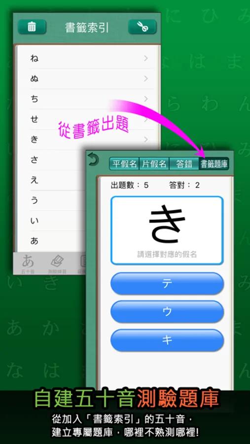 ●自建題庫:利用書籤功能自建專屬的五十音測驗題庫,針對不熟的部份加強練習。