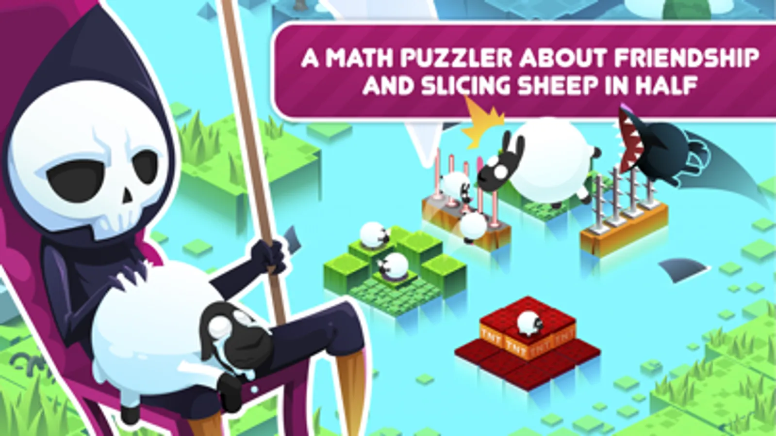 Divide By Sheep is a math puzzler about the Grim Reaper's devious plan to make some sheepy friends. Grim can only befriend the dead, so he decided to unleash a great flood and drag the sheep under. Now stranded on small islands and sinking fast, the sheep need you to help them reach safety.