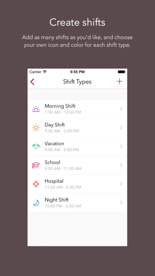 Add as many shifts as you’d like, and choose your own icon and headerr for each shift type.