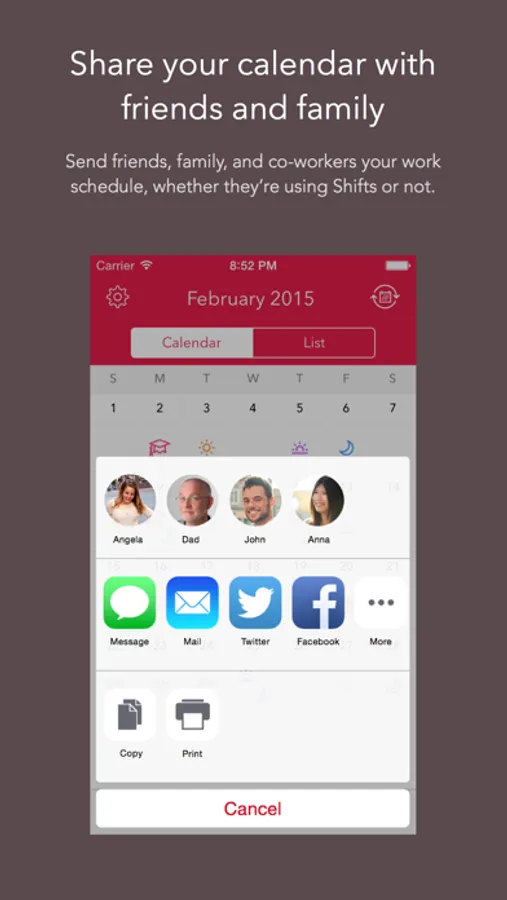 With just a tap you can share your schedule with friends, family, and co-workers – whether they’re using Shifts or not.