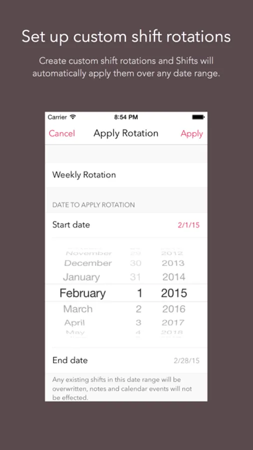 Set up shift rotations and Shifts will automatically apply your shifts over any date range you choose – great for repeating schedules (e.g. a 3-week schedule that repeats for 4 months).
