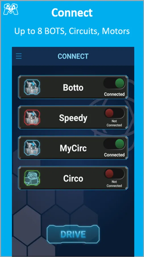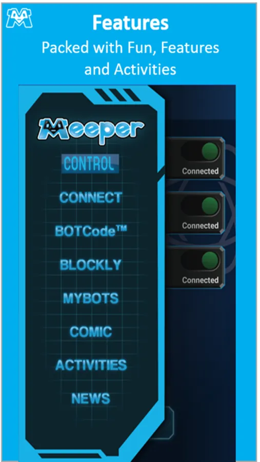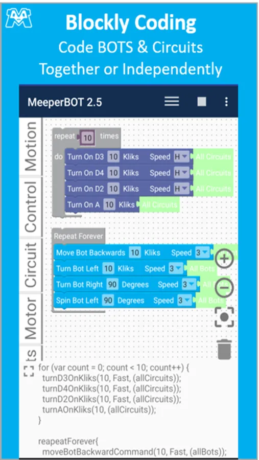 Meeper Robotics allow you to Control and Code the meeperBOT and Meeper Circuit Control to build fun and engaging brick and circuit kits and make them come to life. Build your most amazing brick creation, attach to your meeperBOT and you are off and driving and coding. Assemble simple to complex circuits and Control and Code up to 10 circuits in the Meeper App with both BOTCode® and Blockly. Learn more about Circuits and Robotics with our STEM Lessons used in thousands of schools. The Meeper App allows you to Connect up to 8 BOTS or Circuit Controls. Program simple to highly complex and interactive remote-control vehicle and circuits.