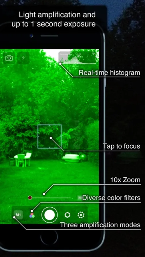 Due to complex mathematical algorithms Night Eyes provides residual light amplification in real-time for your iPhone, iPad and iPod touch without additional hardware.