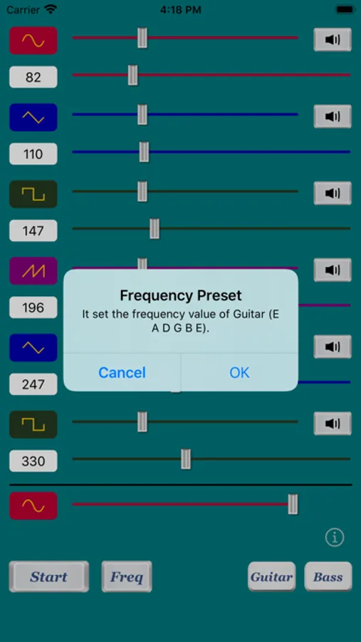 - In the Preset button (Guitar, Bass), it can set the frequency value of Guitar (E A D G B E), 6-string bass (B E A D G C).