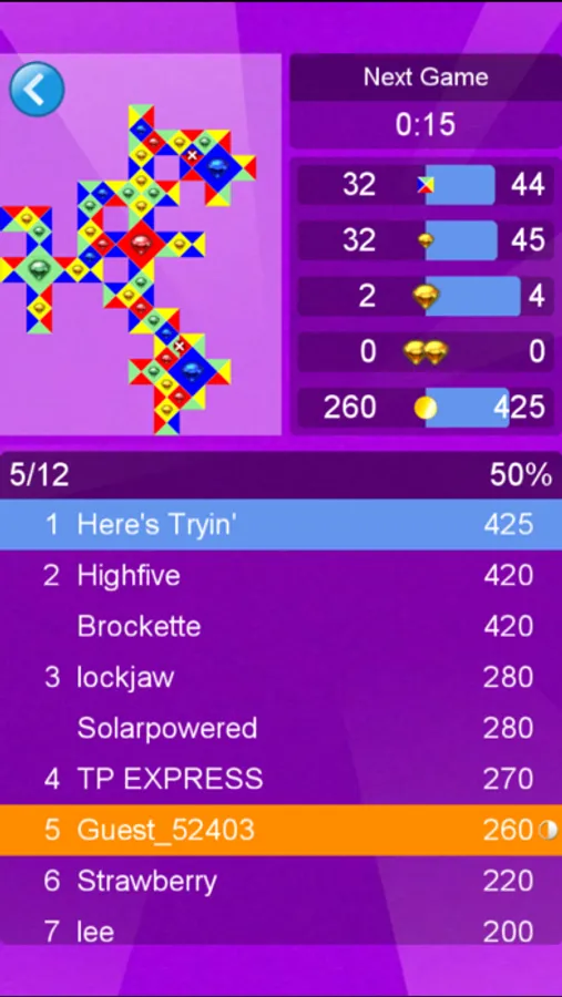 Compete against other players to connect colored tiles and create the highest scoring board of diamonds. The faster you play, the more tiles you'll get, and the bigger and better board you can build!