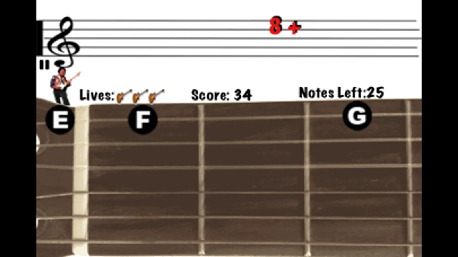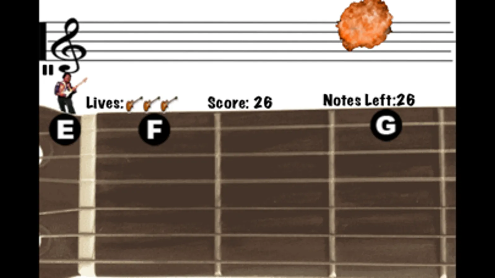 Learn the notes on the staff and where they are on the guitar in a fun way. You have three lives and have to destroy 30 notes to get to the next level. Good Luck!