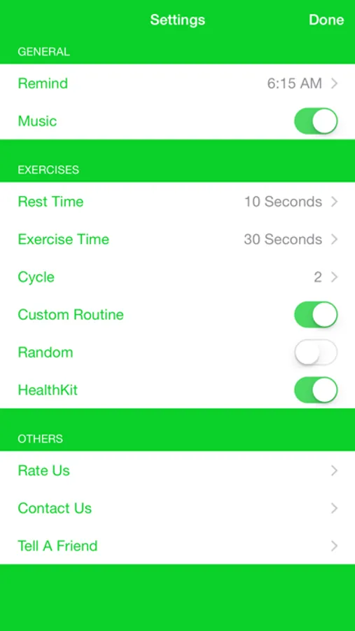 3: Click on Settings for (Music on, Cycle, Workout Time, Routine, Random, Healthkit)