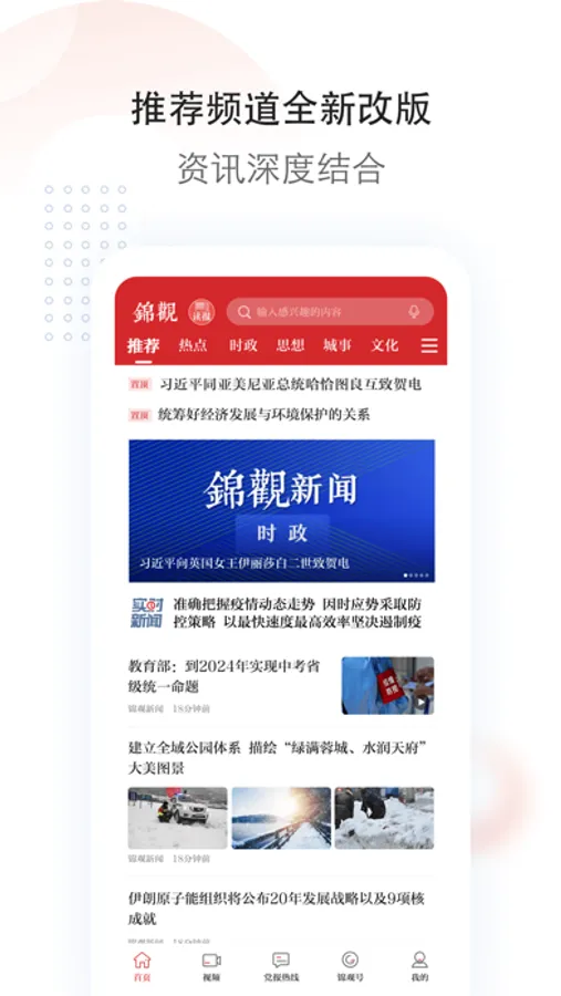 拥有推荐、时政、思想、城事、财经、文化、体育、生活、视听、专题十大频道。