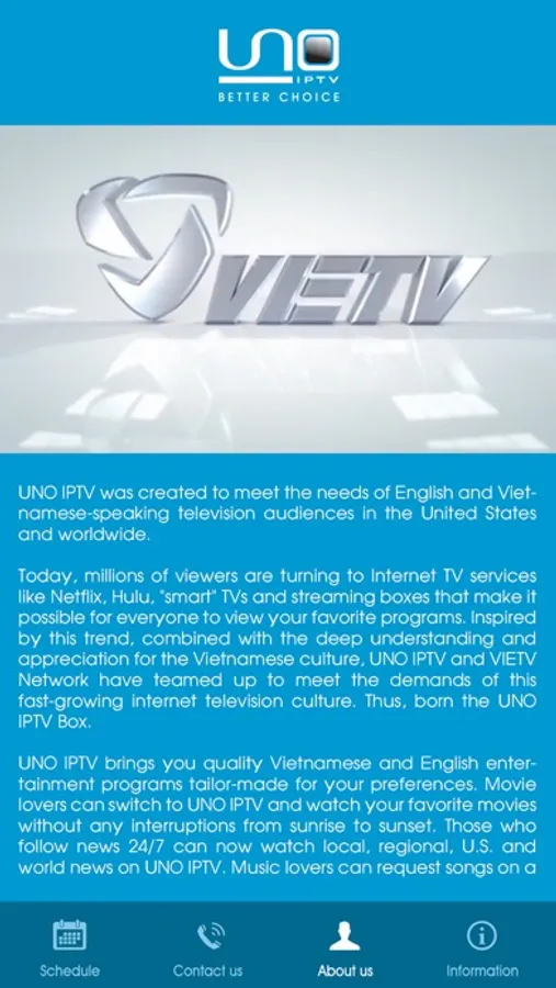 UNO IPTV was created to meet the needs of English and Vietnamese-speaking television audiences in the United States and worldwide.